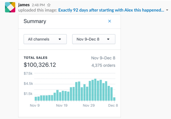 "Alex, I know I keep bombarding you with screenshots but this stuff is going off! Beat my next two milestones ($2k and 100 orders) today! Will finish answering your email tomorrow!"